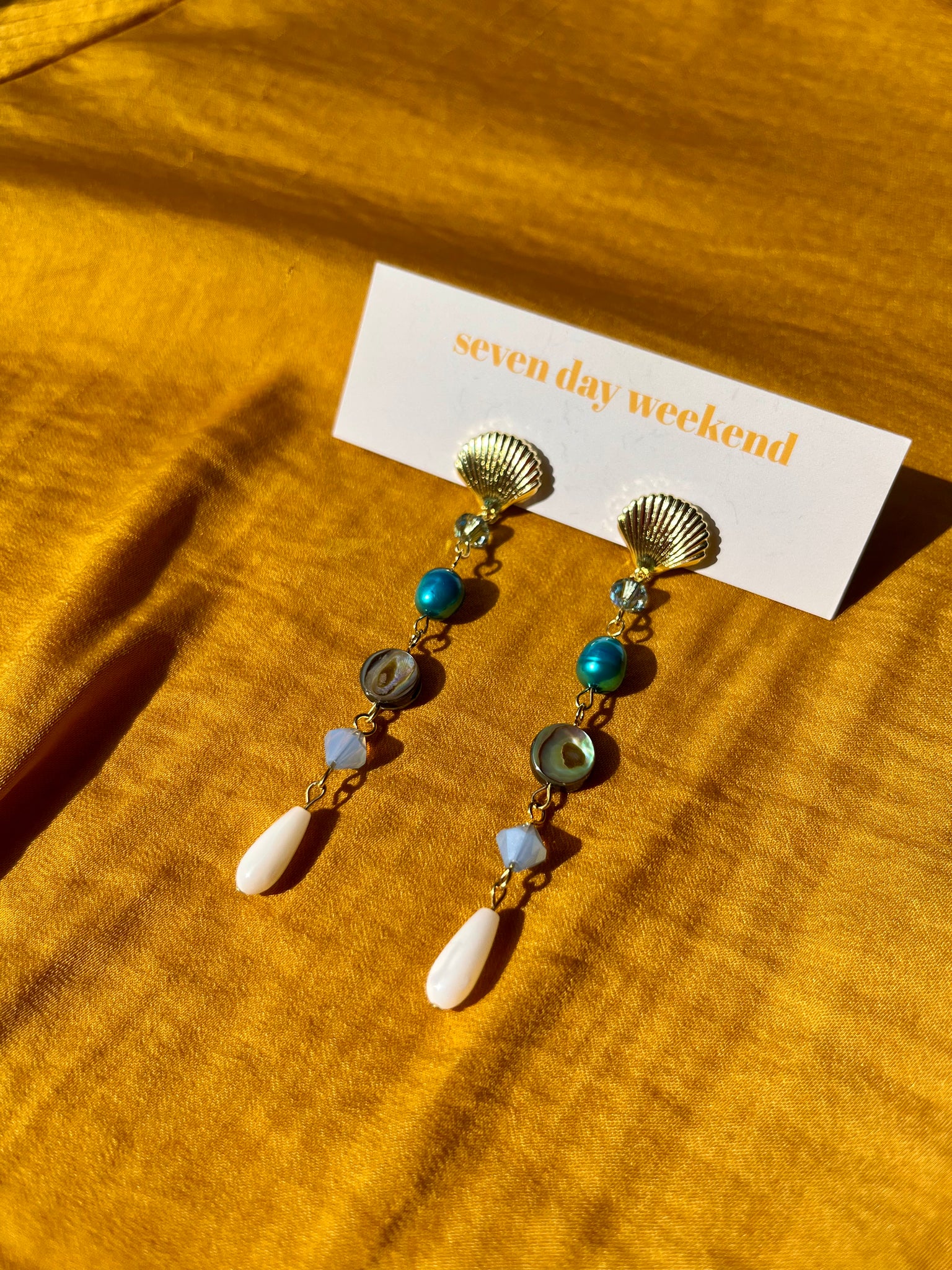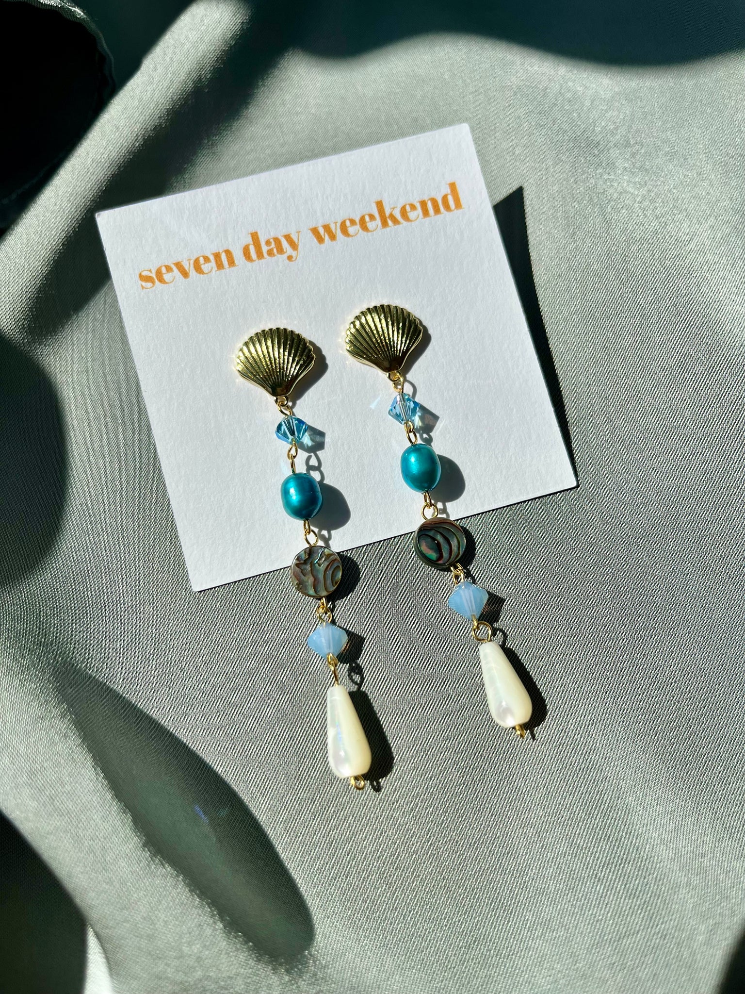 windows down, music up. swarovski crystal + freshwater pearl + abalone with gold plated brass studs.